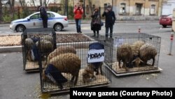 К редакции "Новой газеты" в Москве в понедельник, 29 октября, неизвестные привезли три клетки с овцами, одетыми в жилетки с надписью "Пресса". К клеткам прикреплены таблички с названием газеты.